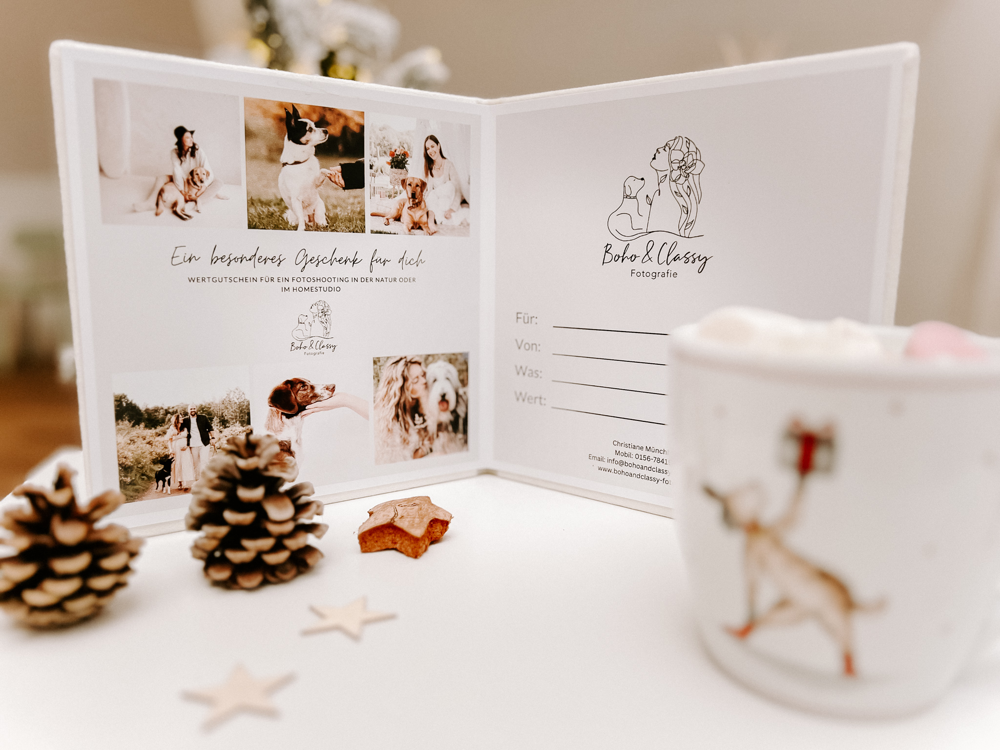 Du erhältst einen hochwertigen Gutschein im Wert von 50-450,- €, der zu einem einzigartigen Hundeshooting einlädt. Der Gutschein kommt im eleganten Aufklappformat (ab 300,-) mit Samteinband (siehe Foto). Wähle zwischen Versand oder Abholung. Der Gutschein eignet sich perfekt als Geschenk und hinterlässt garantiert einen bleibenden Eindruck. Schaffe unvergessliche Erinnerungen an deinen Hund mit diesem besonderen Erlebnis.
